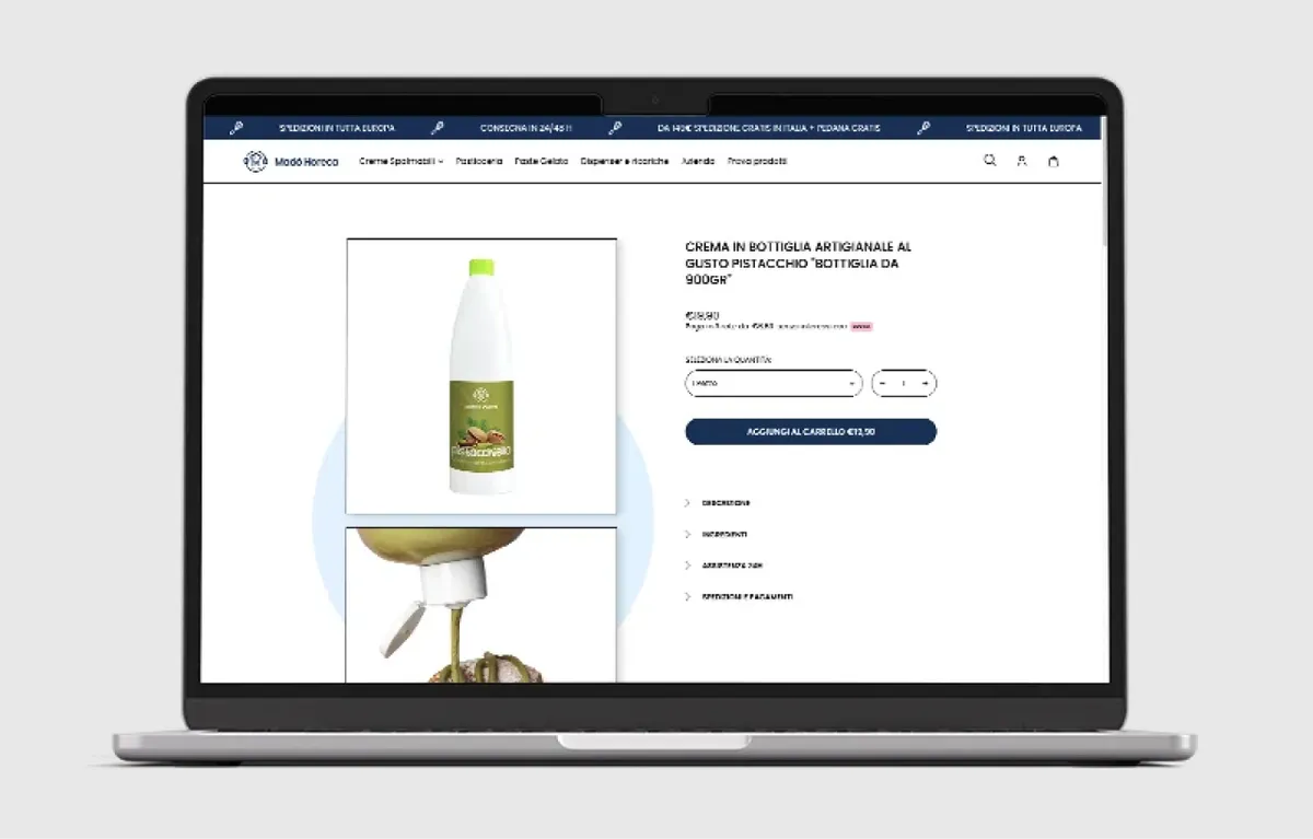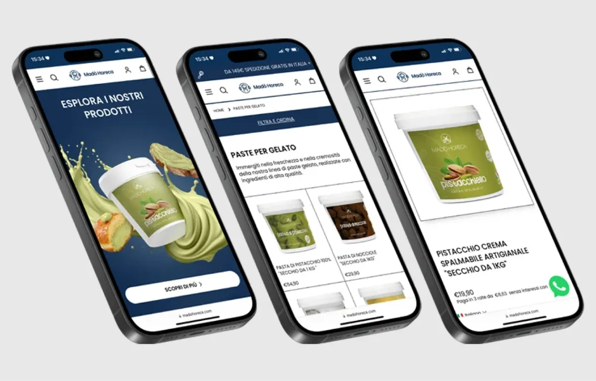 Madò è un laboratorio nato nel 2018 specializzato nella produzione di dolci, prodotti tipici locali e creme spalmabili in oltre 26 gusti. Nell’ecosistema Madò c’è Madò Horeca, il brand pensato per la vendita e distribuzione B2B in Italia e nel mondo. Nel 2024 Madò Horeca vuole dare una svolta omnicanale al suo e-commerce, migliorare la gestione di ordini e inventario, ridefinire il customer journey e aumentare la fidelizzazione dei clienti. Lo user journey era frammentato e confuso, riducendo le potenzialità di vendita. L’approccio mobile-first non era ancora implementato e l’interfaccia del carrello risultava affollata, con CTA poco chiare e dispersive.